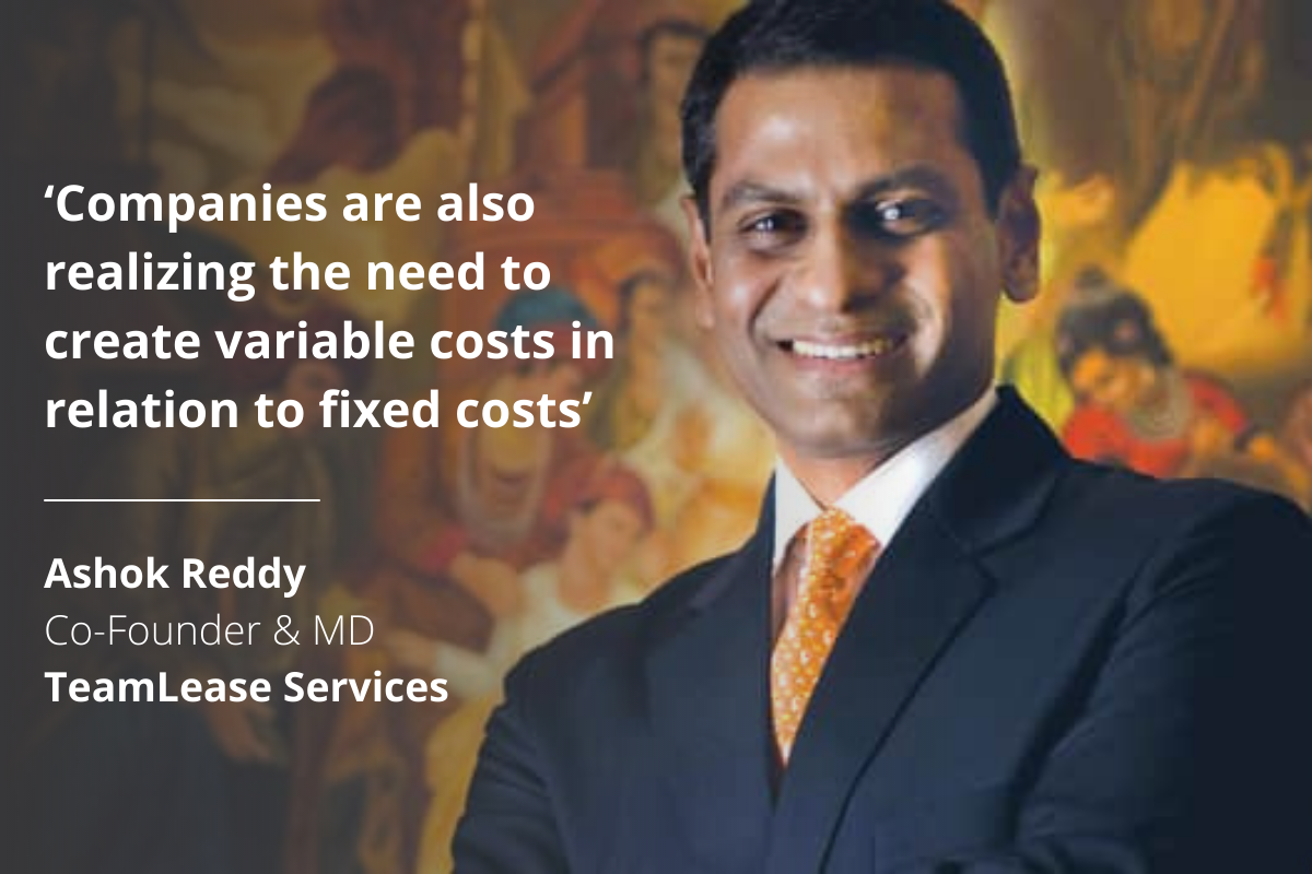 Ashok Reddy, Co-Founder and Managing Director of TeamLease Services Limited, is of the opinion that companies are slowly realizing that people can work from anywhere, can work anytime and work with anybody. The key to focus is on tools to manage and ensure productivity.