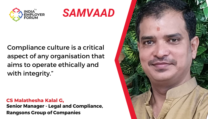 CS Malathesha Kalal G is a Senior Manager – Legal and Compliance at Rangsons Group of Companies. Mr. Malathesha has over 17 years of experience in Legal & Compliance at the Senior Management level, both in listed and unlisted entities including a year of stint heading the Human Resources Department. Before entering corporates, he practiced as an Advocate in the High Courts of Karnataka, Bengaluru. His experience includes Aerospace, Defence, Healthcare, Edu-Tech, Fire Safety, Real Estate, Manufacturing and Bio-Tech. As Senior Manager – Legal and Compliance, he oversees the Compliance and Legal Department of the Group Companies. As Company Secretary, he is responsible for the Corporate Secretarial and Corporate Governance matters. He is a member of the Institute of Company Secretaries of India.
