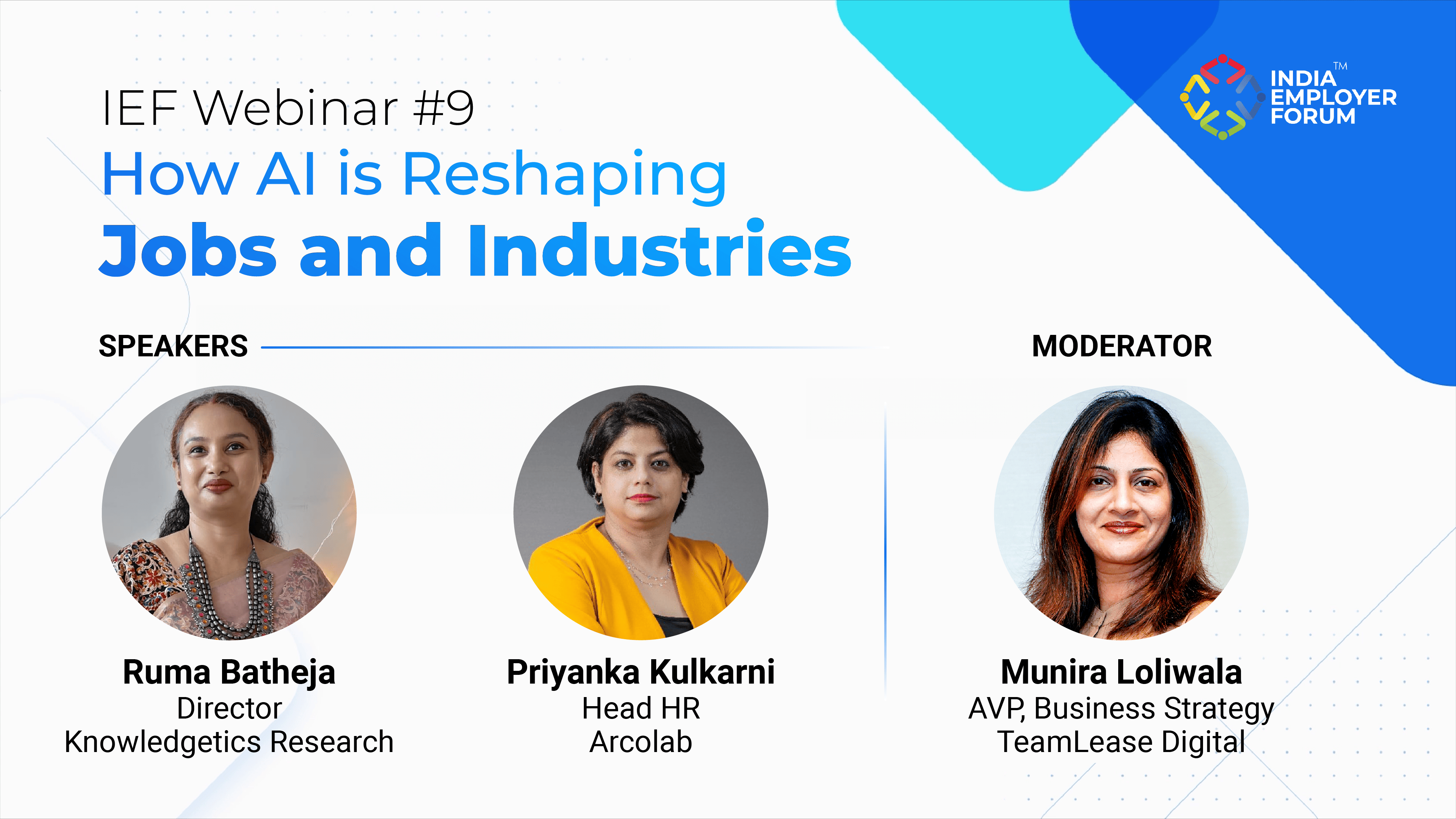 The webinar had two eminent industry experts who shared their views on AI and its impact on work. Munira Loliwala, AVP – Business Strategy, TeamLease Digital moderated the session. Interestingly, this webinar was an all-women panel, breaking the myth that only men are equipped to speak about technical subjects.